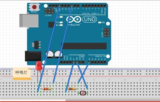 应用拓展: *可以改变灯的颜色种类,做到发出各种各样的光,为室内增添情调; (多增加几个LED灯,或控制亮的次序,做到更好的效果) *可以改变程序,变成植物光照提醒器; (改变光照值(ADbuffer<一个适合的光照强度 就可做到)) *同时改变蜂鸣器的频率可以编成音乐伴人入睡; (采用无源蜂鸣器,设置频率,简谱)(见《欢乐颂》) *也可以作为小夜灯; (微弱的呼吸灯,微弱灯光,随着你的呼吸,陪你一起入眠) *也可与家庭电路连接,自动开关电灯,为家里人提供方便 (在室内光线暗时,自动打开,不用摸黑走路) 构想之一: 实用性:可以保护视力,增加亮度 创新性:与传统的控光系统不同,可自动改变 科学性:适时的开关,不浪费电能,做到节能减排