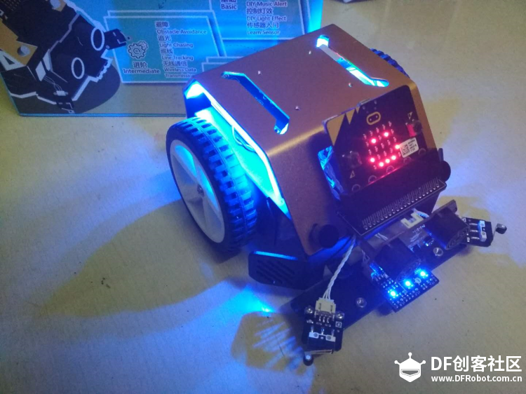 (二)max开箱 有没有发现,DF自从进军中小学创客教育市场,产品萌了许多,许多,许三多。 ![]() 内容还不少呢。 ![]() 摆了一大片。 1、micro:bit 1 2、精美小喇叭 1 3、超声波 1 4、寻线传感 3 5、触碰传感 2 6、TT电机 2 7、车架 1 9、电池盒 1 10、锂电3.7V 2000mA 1 11、金灿灿的外壳 1 12、灯带7灯 2 13、工具 2 14、教程书 1本(电子版3本) 15、螺丝 数据线 寻线地图等 16、扩展板 1 好了,真不少。 扩展板大图。 ![]() 很早就想,有一个小车,可以先带小朋友玩祼板,然后扩展板又能玩,小车又能玩,好象max都能满足了呢。 开始组装上小喇叭。 ![]() ![]() 电机,车轮,超声波。 ![]() ![]() 装电池,很好玩的新款魔术贴。 ![]() ![]() 按说明书接线。 ![]() 当当当,小车完工。 ![]() 灯带装外壳下了。 ![]() micro:bit\小车、扩展板,可以有很多玩法了。 特别提醒,不要只当小车玩,拆开了玩才好。 福利,福利,电子版教程(太大了)附链接,就是没有小车,也可以从中学点东西呢。 1、组装说明 2、makecode版教程 3、mind+版教程 (三)DFrobot探索者MAX机器人! 这么令人青睐的编程小车还是第一次见到 MAX:bot的亲兄弟,探索者MAX了解一下 ![]() 最近真人秀选秀节目真是火到不行,为了自己喜爱的小哥哥小姐姐们能以c位出道各家粉丝们也是四处疯狂拉票,不怎么迷综艺的嗷嗷每天看着满屏的“请pick一下XXX”都开始各种入坑了。 ![]() 要说娱乐圈颜值高才华横溢的小鲜肉多,玩具界中的既有颜又有才新生代编程玩具也超多呢!今天嗷嗷就给大家介绍一下来自DFrobot阳光男孩max。 ![]() 话不多说第一步要看的当然是max的外形啦,黄黑两种配色既经典又不失时尚,小车采用铝合金机身整体造型简约中带着几分酷感,外包装的设计也是简洁明朗十分清爽。 ![]() 当然只是好看可远远不够赢得大家的青睐,Max的一身装备绝对也是够实力派。 ![]() 整套玩具内含有Arduino内核主板、单总线接口、带补光巡线传感器、超声波光敏二合一传感器、声音传感器、彩色表情面板、高品质音效模块、蓝牙通信、RGB灯×4。 ![]() 除此之外小车还有金属舵机、金属顶盖、数字口传感器、模拟口传感器等可扩展装备。 ![]() 官方还为它写了一份个人简介,MAX是一位8岁的活泼开朗型男孩,日常生活中喜欢探险、编程和音乐,最喜欢的颜色是红色、橙色和蓝色。这些可不是官方随意写写,在Max的日常生活中都能体现出来哦。 ![]() ![]() (超声波避障) 将MAX放在地上,MAX如果遇到前方30cm左右有障碍物,就会转弯往另外一边行驶。 ![]() (红外巡线) 拿出附带的巡线地图,平铺在地板上,然后把MAX放到黑线上,MAX就会跟着黑线行驶。 ![]() (光敏追光) 打开手机的手电筒功能,对着超声波旁边的光敏传感器照射,MAX就会跟着光线强的一方行驶。 ![]() (蓝牙遥控) 下载“走你”蓝牙遥控程序,手机靠近MAX,蓝牙将会自动连接,连接成功后,MAX的主板LINK灯会亮,软件里面的蓝牙标识会变成绿色,操作右侧的方向按键,MAX就会前后左右行驶了。 ![]() 想要挖掘max的更多个性和属于你的独特玩法,这样简单的几点当然是远远不够的啦, 在电脑上下载好Arduino IDE软件开始学习编程吧。 ![]() 编程后你可以自定义max的行走路线、led灯的闪烁方式、使用超声波测距、播放音乐等等超多玩法,每一种玩法都被官方列为一节小课程,其中详细介绍了课程知识点和具体操作方式。 ![]() 嗷嗷觉得最为可爱的一点就是你可以自行为max设计表情,小车本身在避障、巡线时自带了23种表情,通过编程你可以进一步控制小车的表情来配合既定的动作。 ![]() 甚至你还能自定义表情包,自己控制表情图案和颜色,这种独一无二之处才是养成的乐趣所在嘛。 想要了解更多关于max的有趣玩法,不如pick一台自己带回家慢慢研究吧 好吧,上面这么萌的MAX,这么煽情的介绍,大圣老师被蒙到了,所以pick一台回来了。 不,现在还在快递路上。 (四)Max接上物联网这一阵子参加物联网小赛,对万物互联有了更多的认识,什么都想要物联上试试。 真是怕了DF了。这个MAX:BOT,DF却是很高调的只在线下销售,只在线下,线下销售。 主要对应学校,机构等大客户,商城里没有介绍,老师们并不熟悉,大圣老师要带小伙伴们走近她,揭开她神秘的面纱,让她走到伙伴们面前。 根据大圣老师的对比观察,MAX:BOT是MICROsoft:BIT版的,探索者MAX是ARDUINO版的,两者用了同样的车架,同样的顶盖\电机\车轮\超声波\寻线\电池盒\,不同的只是主控板,多了触碰传感和灯带。 从而有了不同的课程,不同的玩法,不同的软件,不同的你。 广告完毕,老板,我要申请广告费 。书归正传,我要物联她。 ![]() 不知道是故意还是故意,超声波的4p接线用的是p1P2,正好可以接OBLOQ模块,那就接上吧。 程序做个简单的。 我发现,OBLOQ软件包可以直接搜索到了。 ![]() 用MAX:BOT时,不用添加扩展包,全部用makecode来编程,这样省略了大家添加扩展包,忘记扩展包地址的麻烦。这也是一个微创新呢,赞一个。 而且,MIND+对自家的小车也是优先支持,用起来也很爽的。 makecode完整程序如下: https://makecode.microbit.org/_fsfh66bA2RvD 这里不给截图了哈。 评委老师请点上面链接看吧。 ![]() 哈哈,max来的主要任务是为了打架,不是,是战斗,保卫基地,所以先给些简单粗暴的功能吧。 (五)战斗吧,Max IOT星球做好了战(da)斗(jia)准备,对帝国主义亡我之心的警惕,一天也不能放松。 毛主席教导我们,人不犯我,我不犯人,人若犯我,我必让他肠