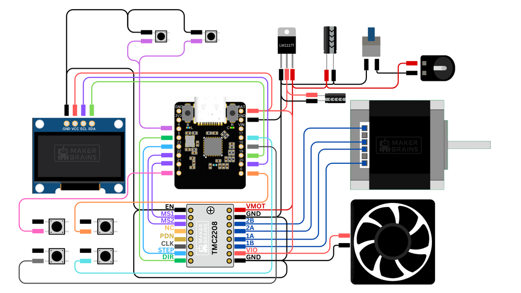 本帖最后由 神经翻译局 于 2025-3-27 15:03 编辑 ![]() ![]() 拍摄流畅、电影般的镜头可以为视频和摄影带来额外的专业感。然而,高质量的摄影滑轨通常昂贵、笨重,对于DIY创作者或刚刚起步的人来说,难以接受。 这个项目的来源:一个由回收的3D打印机零件制作的单向线性摄影滑轨,设计上注重成本效益、功能性和可定制性。 在这个指南中,你讲学会如何从旧3D打印机中回收的零件制作DIY摄影滑轨。项目包含从在Fusion 360中设计和建模到使用最少的额外组件(如ESP32微控制器、一个小型OLED显示器和几个按钮)组装滑轨的所有内容。你可以轻松实现控制速度、微步和寻零,设计出专业级的功能而不需要专业的价格。 这个项目非常适合希望升级旧设备、探索DIY电子产品或在预算内提升摄影设备的人。让我们开始吧! 所需材料 ![]() ![]() ![]() ![]() ![]() ![]() ![]() ![]() ![]() ![]() ![]() ![]() ![]() ![]() ![]() ![]() ![]() ![]() ![]() ![]() ![]() ![]() ![]() ![]() 所需材料: 1x ESP32 C6 Mini 1x TMC2208 1x LM1117T 2x 30X70 mm Prototyping Board 1x 0.96" OLED Display 1x 5050 5V Fan 4x Tactile Push Buttons 2x 5mm Push Buttons 1x DC Female Connector 1x Male Connector 1x Female Connector 1x Belt 1x Jumper Wires 1x 12V 2A Power Supply 1x DC Push Switch 从旧3D打印机获取的部件检查列表: 1x 4020 400mm铝型材 1x 步进电机 4x 滚轮 1x 皮带张力滚轮 10x M4 T型螺母 7x M4 15mm螺钉 6x M4 8mm螺钉 4x 用于步进电机的M2螺钉 1x 步进连接器 4x M2螺钉 2x M3螺钉 ![]() ![]() ![]() ![]() ![]() ![]() 制作这个相机滑轨的第一步是在Fusion 360中创建详细的3D模型,以确保每个组件能够完美地配合。由于我复用了Ender 3 3D打印机的部件,所以我直接从它的设计中导入标准组件,节省了时间,包括铝合金型材、步进电机、滚轮、螺丝和螺母。另外,我还加入了一个预制的128x64 OLED显示器模型,以便在滑轨中视觉化其位置和适配情况。 为了完成滑轨,我在Fusion 360中设计了一些定制组件: 按键:为了直观地控制滑轨的速度和方向而建模。 外壳:为电子设备和电机设计了一个紧凑且保护性的外壳。 风扇装置:为5050 5V风扇设计的插槽,帮助在运行过程中保持组件冷却。 滑轨脚:稳定的支撑,保持滑轨水平和安全。 限位开关装置:放在两端,允许自动改变方向,增强滑轨的功能性。 设计完成后,我打印了定制的部件,确保它们足够耐用,可以反复使用。有了完整的3D模型,我开始进行下一步:组装! 需要打印的部件: 1x电机安装座 1x覆盖板 2x腿 2x限位开关安装座 1x快速释放板 1x快速释放旋钮 1x侧面通风口 1x风扇通风口 ![]() ![]() ![]() ![]() ![]() ![]() ![]() ![]() ![]() 在这一步,我们将组装快速释放机制,这样可以轻松地将您的相机或其他设备从滑轨上安装和拆卸。 收集组件: 3D打印的快速释放板 3D打印的快速释放旋钮 3D打印滚轮 M4x15螺丝 安装滚轮: 拿取3D打印的快速释放板,它有用于安装滚轮的孔。 将滚轮放在孔上并固定在位。确保它们被牢固地固定,以防止使用过程中的任何移动。 安装快速释放旋钮: 接下来,将快速释放旋钮安装到快速释放板上。这个旋钮将使您能够轻松地将相机从滑轨上锁定和解锁。 将快速释放板滑入铝型材: 一旦组装完成,将快速释放板滑入铝型材,确保它紧密适合并且能沿着型材的长度平滑移动。 皮带张紧器滚轮是维持皮带适当张紧,确保相机滑轨平稳操作的重要组件。 下面是如何组装它: 取出您旧3D打印机中的皮带张紧器滚轮。 将其放在型材的端部,将皮带张紧器滚轮牢固地固定到铝型材上。确保它紧紧地固定,以防止在操作过程中的任何移动或滑动。 ![]() ![]() ![]() ![]() ![]() ![]() ![]() ![]() ![]() ![]() ![]() 限位按钮对于确保摄像滑轨的安全操作至关重要,当滑轨到达行程的尽头时,它能自动停止。请按照以下步骤组装限位按钮: 收集组件: 2 x 5毫米按键 长电线 热缩管 2 x 3D打印的限位按钮架 快干胶 2个M4 T型螺母 2 x M4x8毫米螺丝 准备按键: 取两个5毫米的按键,将长电线焊接到每个端子上。这将方便以后连接到微控制器。 焊接完成后,将热缩管滑过焊接的连接点,然后加热以固定它们,确保连接处被绝缘和保护。 安装按键: 取3D打印的限位按钮架,用快干胶将每个按键固定到各自的架上。让胶水彻底干透后再进行下一步。 固定限位按钮: 将限位按钮架位置在铝型材的两端。使用T型螺母和M4x8毫米螺丝将架牢固地固定在位。确保按钮容易接触到,并且能正确对齐以在滑轨到达两端时激活。 ![]() ![]() ![]() ![]() ![]() ![]() ![]() 在这一步中,我们将安装步进电机,它将驱动相机滑块的移动。按照以下步骤完成电机组装: 收集组件: 3D打印电机座 步进电机(从您的旧3D打印机中回收) 来自旧打印机的螺丝(用于固定电机) 带有焊接线的12V DC女性连接器 2个M4 T型螺母 2个M4x15mm螺丝 安装步进电机: 取出3D打印的电机座,并将步进电机放入其中。使用您从旧打印机中保存的螺丝将电机牢固地固定在座位内。 连接电源: 接下来,取出带有焊接线的12V DC女性连接器。将其插入电机座上的指定插槽,并将其紧固。 固定电机组件: 电机安装好后,将整个组件放在铝合金型材的另一端,与您放置张紧滚轮的地方相对。使用2个M4 T型螺母和2个M4x15mm螺丝将电机座固定在铝合金型材上。 ![]() ![]() ![]() ![]() ![]() ![]() ![]() ![]() ![]() ![]() ![]() ![]() ![]() ![]() ![]() ![]() 现在是连接各种电子组件的时候了,由于涉及的元素数量众多,包括ESP32-C6迷你微控制