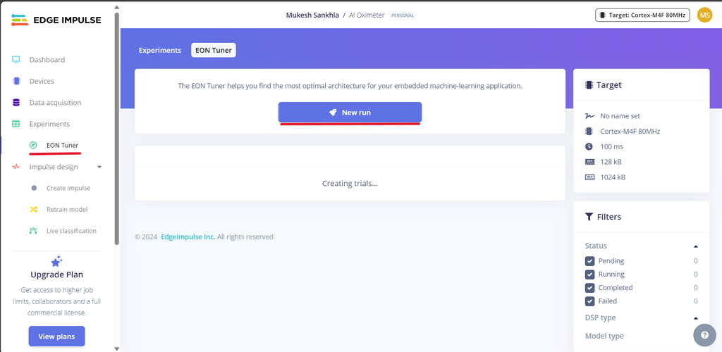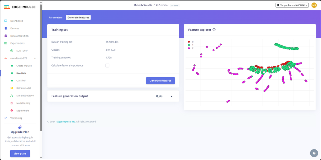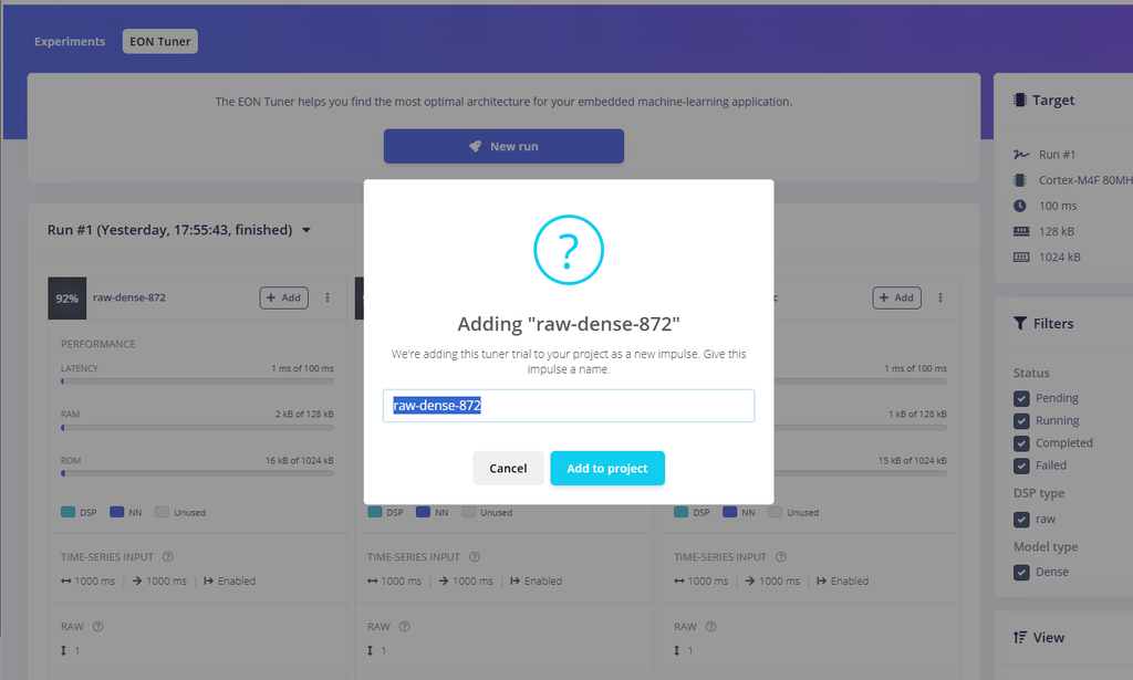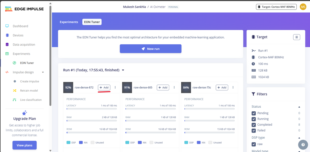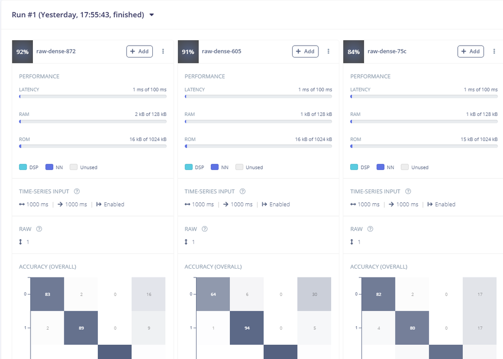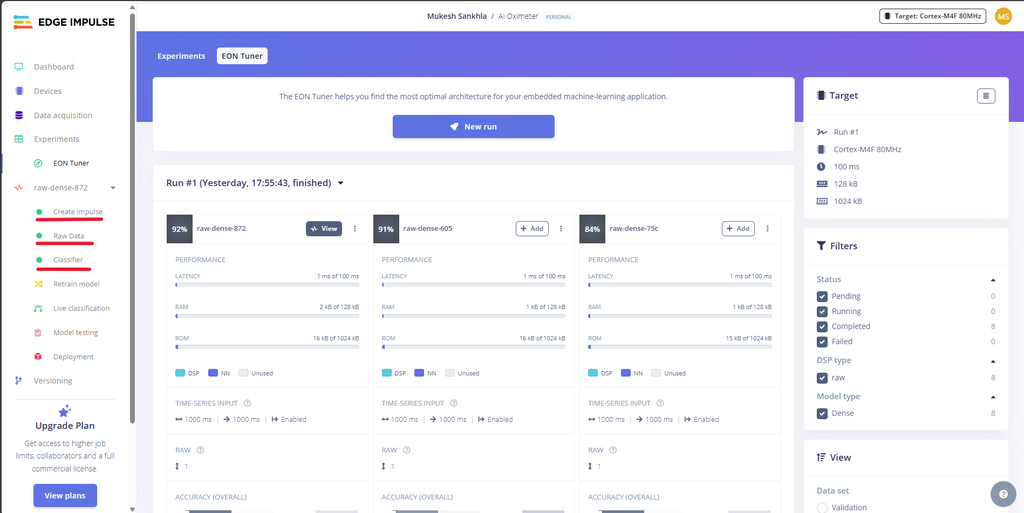 ![]() ![]() ![]() 步骤9:导入数据![]() 理解数据采集面板: Edge Impulse中的数据采集面板允许您上传数据,从连接的设备收集数据,并管理您的数据集。 您可以从CSV文件上传数据,使用内置工具进行实时数据收集,或导入预录制的数据集。 从Kaggle下载数据: 由于我们最初没有数据,我从kaggle.com下载了包含SpO2,心率,体温和状态标签的健康数据。 导入CSV数据: 在数据采集面板中转到“CSV向导”。 上传您下载的Health Data.csv文件。 将“这是时间序列数据?”设置为否。 选择“状态”作为您的标签。 点击“完成向导”。 拆分数据: 再次上传Health Data.csv。 勾选“在训练和测试之间自动拆分”。 如果您的数据已经分开了,上传它们 手动地将数据分为训练和测试数据集。 数据集概览: 上传完成后,您将在数据集标签页中看到您的数据。 确保你的数据以80-20%的比例分配到训练和测试中。 你收集的数据越多样且准确,你的模型表现就会越好。 ![]() ![]() ![]() ![]() ![]() ![]() ![]() ![]() ![]() ![]() ![]() 步骤10:理解和使用 EON 调谐器![]() 访问EON调谐器: 在您的Edge Impulse项目中导航到EON调谐器面板。 点击New Run,然后选择Use Template。 选择Motion Events模板。 (这个选择基于使用场景,其中模型需要分类不同的运动模式,如手势或体育活动。) ![]() ![]() ![]() 最后,点击Start Tuner。 EON调谐器将开始优化您的模型架构,以找到性能、准确性和资源使用之间的最佳平衡。这个过程可能需要一些时间,因为它需要测试多种模型配置。一旦完成,它将列出结果,最佳性能的配置显示在顶部,较不理想的配置显示在底部。 理解结果:EON调谐器显示每个模型配置的关键指标,例如延迟,RAM,ROM和整体准确性。以下是对图像和 指标: 模型配置:每张卡片都代表一个不同的模型架构。 例如,图片中显示的三个模型分别标记为 raw-dense-872、raw-dense-605 和 raw-dense-75c。 性能指标: 延迟:模型进行预测所需的时间。在这些示例中,所有模型的延迟都是1ms,这意味着它们非常快。 RAM:运行模型所需的内存。更紧凑的模型使用的RAM较少,如第三个模型(1 kB)。 ROM:模型的存储大小。同样,像第三个模型这样的小模型更高效,使用了15 kB的存储空间,而不是16 kB。 准确性和混淆矩阵:每张卡片都包含一个混淆矩阵,用于说明模型在不同类别间的性能表现: 对角线值表示正确的分类。 非对角线值表示分类错误。 对角线单元格越暗,模型的性能越好。 F1分数:将精确度和召回率综合成一个指标,每个类别都有显示。F1分数越高,性能越好。 选择最佳模型: 在这个例子中,raw-dense-872的准确性最高(92%),在所有指标(例如,F1分数超过0.88)上的表现都很强。 如果资源限制(RAM或ROM)更重要,那么像raw-dense-75c这样的小模型(准确性84%)可能是更好的选择,尽管准确性较低。 ![]() ![]() 步骤11:使用 EON 调谐器![]() ![]() 一旦确定了最适合的模型,点击添加将其集成到您的Edge Impulse项目中进行部署。 Edge Impulse会自动为您创建完整的冲动,其中包括以下组件: 原始数据块:配置为适当处理您的原始输入数据。 特征提取器/处理块:基于所选模型进行优化。 分类器:已进行微调并准备好部署的机器学习模型本身。 如果你不使用EON调谐器: 如果不使用EON调谐器,你需要手动配置管道中的每个步骤,包括: