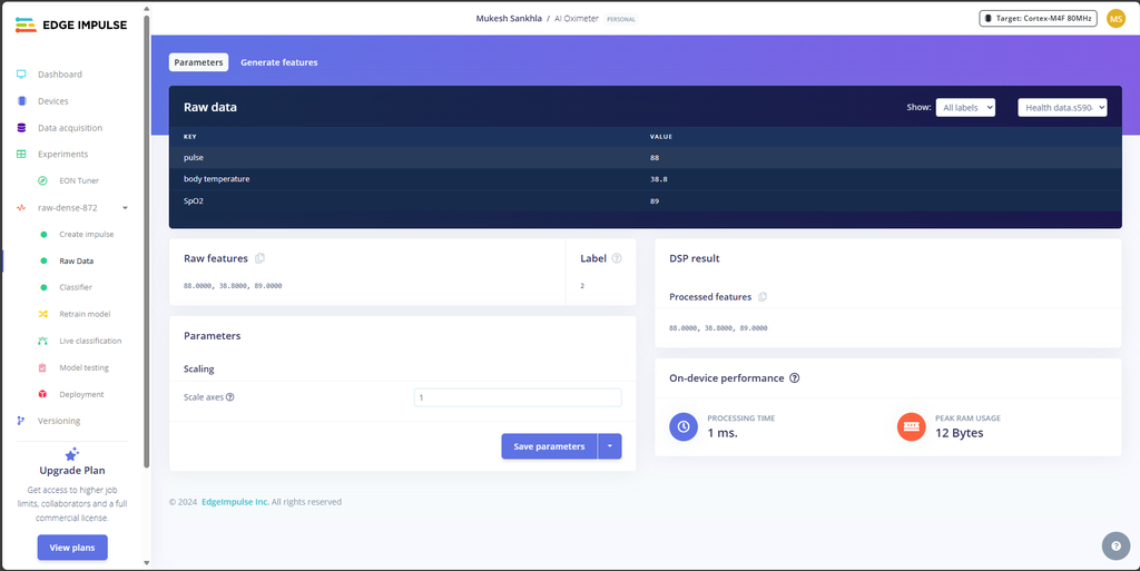 如果您更改了 Edge Impulse 项目的名称,则必须使用新项目名称更新 #include <AI_Oximeter_inferencing.h> 行。 #include <新项目名称_inferencing.h> 步骤18:结论该项目展示了Edge Impulse的AI功能成功地与实时传感器数据集成,构建了一个AI驱动的血氧仪。通过利用MAX30102传感器,ST7789 TFT显示器,和一个自定义训练的Edge Impulse模型,我们创建了一个紧凑、高效的设备,能够监测关键的健康参数,如SpO2、心率和体温。AI基于分类的添加增强了血氧仪的功能,根据实时数据提供用户的健康状态(好、坏、生病)的直观评估。 需要注意的是,这个设备仅用于教育目的,不应被信任用于专业的健康监测或诊断。虽然它展示了机器学习和物联网的潜力,但它不是一个认证的医疗设备,不应该被用来替代医疗级设备。 感谢你和我一起进行这次旅程。如果你喜欢这个项目,请不要忘记点赞、评论,并分享你自己的经验。未来充满了无限的可能性,我很期待看到你们用这项令人惊叹的技术创建的惊人项目。 |