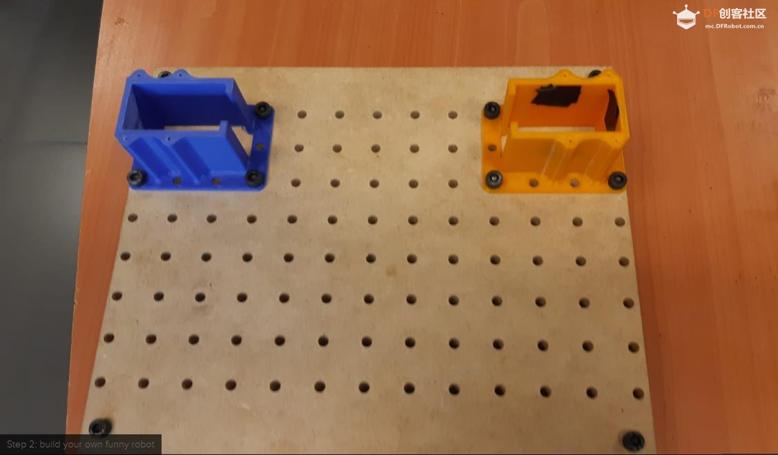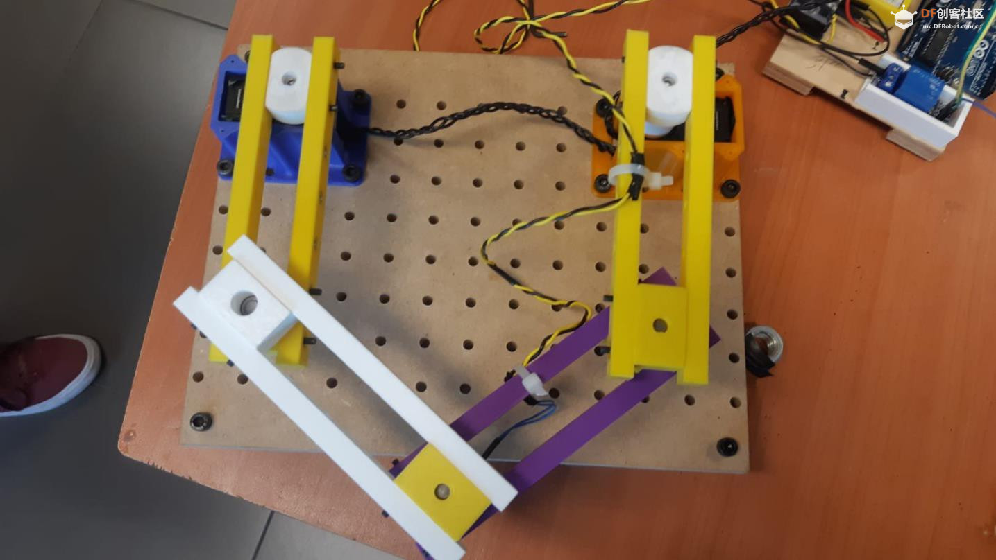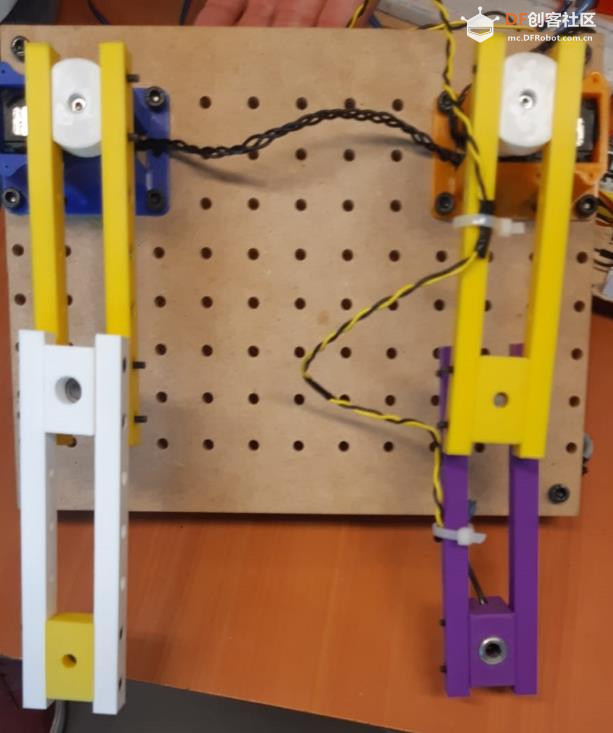第 1 步:验证一切是否正常工作 注意:以下步骤都不需要将电源连接到任何开发板,但如果您想这样做,请在将开发板插入 PC 并打开端口之前将电源连接到开发板,因为这可能会导致 PC 短路和/或部分烧毁开发板(我们经历了两次, 所以请不要) 插入 Arduino 板并打开 Arduino IDE (https://www.arduino.cc/),然后转到工具,然后转到端口,并检查您连接 Arduino 的端口名称是否包含“(arduino)”,否则 python 程序将无法识别它。然后,从 Basics examples 文件夹上传 blink 草图。验证它是否已成功上传,以及 Arduino 板的 LED 是否正常闪烁。 然后,将 Communication examples 文件夹中的 PhysicalPixel 草图上传到 Arduino 板。您也可以在此项目的文件中找到此草图。检查它是否已正确上传并断开 Arduino 板的连接。 现在,从 Lewansoul LX-16A 文档(http://bit.ly/2rJshh6 LX-16A 文件夹中)将总线伺服端子 V1.7 安装到您的 PC 上,并将总线伺服控制器插入您的 PC。运行 Bus Servo Terminal 程序,您应该会看到如下内容: 单击 COM 并打开将控制器连接到的端口,然后单击 Open port。如果舵机工作正常,舵机的 LED 应该会亮起,您应该能够看到舵机的 ID 和舵机在当前状态下的当前位置。如果没有电源,如果你在伺服测试中改变位置,舵机不会移动,但这不是必需的,因为我们将在 python 程序中这样做。现在,转到 参数。您应该看到如下内容: 将舵机的 ID 更改为您稍后将在代码中使用的 ID(左舵机和右舵机的 ID 分别为 4 和 6,但您可以稍后在代码中编辑),然后单击 Apply。完成后,您可以单击关闭端口,连接第二个伺服并重复,并确保签署与珍贵 ID 不同的 ID。即使您不使用代码中的 ID,您仍然需要为每个伺服器分配不同的 ID 才能同时使用它们。完成后,再次单击 关闭端口,然后断开所有内容并关闭程序。 第 2 步:构建自己的搞笑机器人 首先,使用 M5 螺钉和螺母将伺服底座固定到底座上,如下所示。如果您使用额外的螺钉作为支撑,请将较大的螺钉放在角落上,如下图所示。如果您使用其他任何东西作为支撑(如瓶盖),请将它们粘在额外螺钉所在的下方: 然后,在伺服系统上,使用不同长度的 M3 螺钉和每个螺钉的螺母将肩部拧到每个伺服器上,将螺母放在伺服器和肩部底部之间。 然后,将舵机连接到控制器。伺服系统可以通过在其下方使用第二个端口来串行连接,而不是为每个伺服器使用一个端口,在这种情况下,在组装所有东西时允许控制器板进行更多移动。 现在,将它们放在底座上,并确保肩膀没有完全拧紧,以便您以后调整它们。此外,记下 BEHIND 中伺服系统的 ID 和位置,以便根据需要在代码中编辑它们。 然后到手臂:取 2 个手臂的一半、一个轴承、一个销、每个手臂的一个弯头和至少 4 个螺母,然后像这样组装它们。确保所有东西都紧紧配合,尤其是销钉。请注意,您只需将坚果放在臂的一半之一上,如果您打算使用最少数量的坚果,请在每个臂的一半的两端放置 2 个坚果: 有了这个,使用 M3 螺丝把所有东西放在一起,每端 2 个: 这将是手臂的基本组件,但现在把这个放在一边。 现在,再重复两次,但每只手臂只使用一个针肘,然后将它们拧到肩膀上。确保针在上臂上向下,在下臂上向上,如下所示: 现在,组装电磁铁弯头。先将电磁铁放入内部,对齐其电缆,然后将其拧到弯头并将轴承放在顶部。 使用剩余的轴承弯头和电磁铁重复机械臂组件。拿起剩下的两个臂,将它们放在每一侧,并确保在组装时销钉不会滑入其弯头: 最后,连接每个臂的末端,并确保销钉不会滑动。 第 3 步:电子元件 首先,将降压连接到电源,打开,拧紧降压顶部的金螺丝,将输出电压调节到 6V,同时用万用表检查。 现在,关闭电源并按如下方式进行连接,但不要将 USB 数据线连接到您的 PC。 请注意,您也可以通过更换条带上的连接来使用 2 节 6V 电池代替电源和降压电池:将一块电池单独用于伺服控制器,另一块用于继电器和电磁电路。 此时您可以打开电源以验证板和舵机是否打开,并且没有任何东西开始自行燃烧,以防万一。 第 4 步:代码 下载并打开您喜欢的代码编辑器软件(例如 vs code)上的代码文件夹,然后打开 Scara.py 文件。然后,检查 Scara.py 文件中的 ID 是否与您在伺服系统上设置的 ID 匹配。这些 ID 位于代码的第一行: 代码上的默认 ID 为左伺服器 (id_derecho) 的 4 和右伺服器 (id_izquierdo) 的 6 。如果您使用了不同的 ID 或按不同的顺序,请直接在代码上编辑它们。 您现在可能想要编辑的另一个参数是伺服系统的速度。在主循环之前的最后几行代码中,有 velp 参数,它表示两个伺服系统上每毫秒的步数。它默认设置为 0.5,这不是特别慢,但将其提高到 0.7 足够快,机器人不会崩溃,而 0.2 则足够慢,让您有足够的时间断开任何东西。 您还可以更改代码上的默认尺寸,以 l11、l12、、l21、l22 和 d_motor 表示,它们代表右肱骨、右前臂、左肱骨、左前臂和伺服系统中心之间的距离,均以厘米为单位。 现在,打开电源,然后才将板子连接到您的 PC 并运行 Scara.py 文件。如果一切正常,代码应该可以正常运行,并且应该在控制台中请求命令。 第一个命令 “SS” 允许您更改代码用于计算任务空间的尺寸(以 cm 为单位)以及它发送到伺服器的角度。键入后,程序将按顺序询问伺服器之间的距离、右肱骨、右前臂、左肱骨和右前臂的长度。这是为了在重新组装机器人后调整代码,这是它的主要目的。 下一个命令 