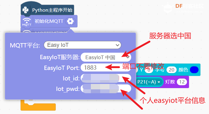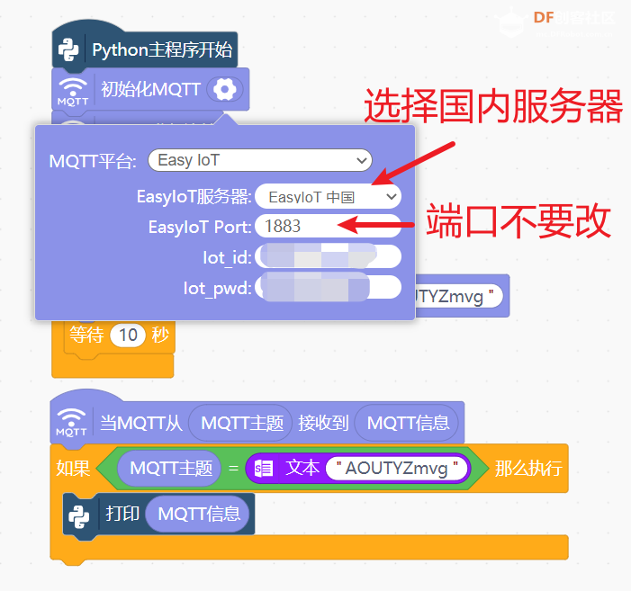 编写逻辑: M10一定要先联网再去运行程序,"MQTT保持连接,永久"这个积木很重要。