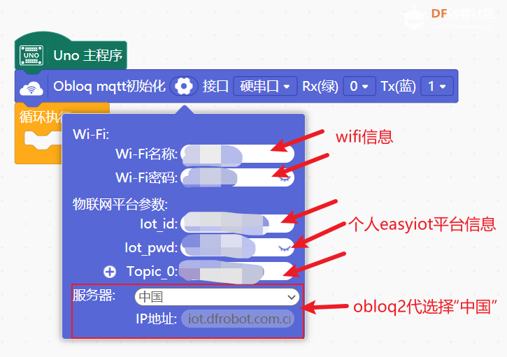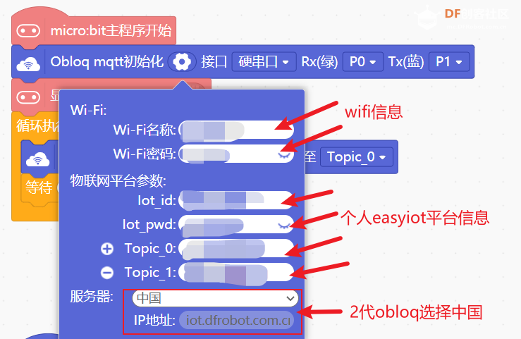 | 程序里面填写easyiot备用服务器,服务器选择SIoT,IP地址填 obloq1.dfrobot.com.cn |