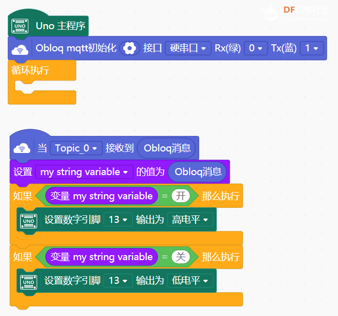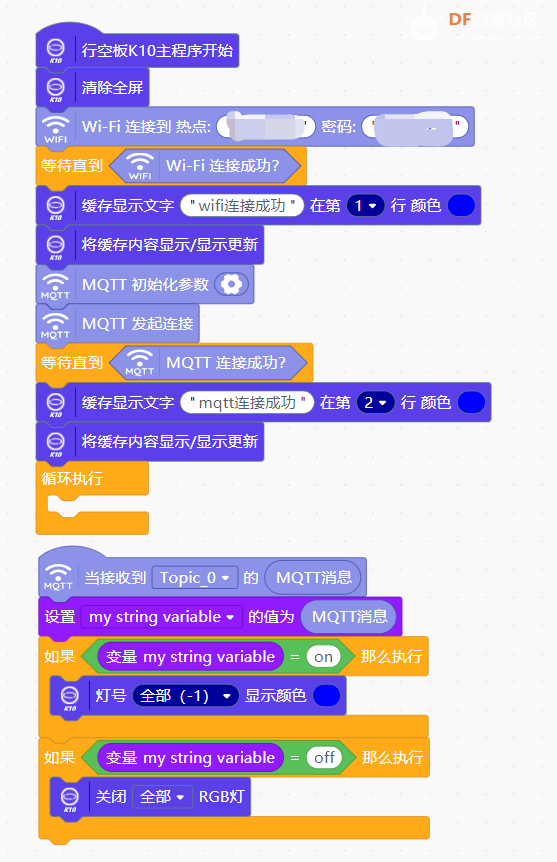 编写逻辑: 一定要先连上wifi再去连mqtt,"等到直到"这个积木很重要。