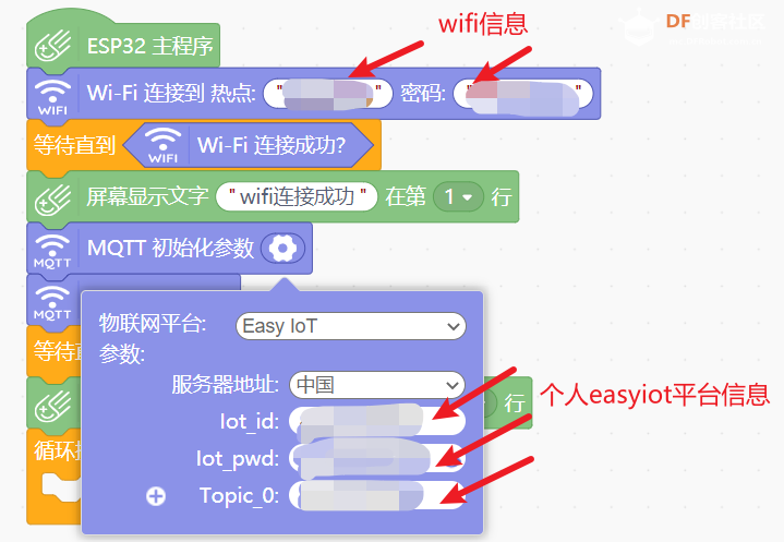 编写逻辑: 一定要先连上wifi再去连mqtt,"等到直到 "这个积木很重要。