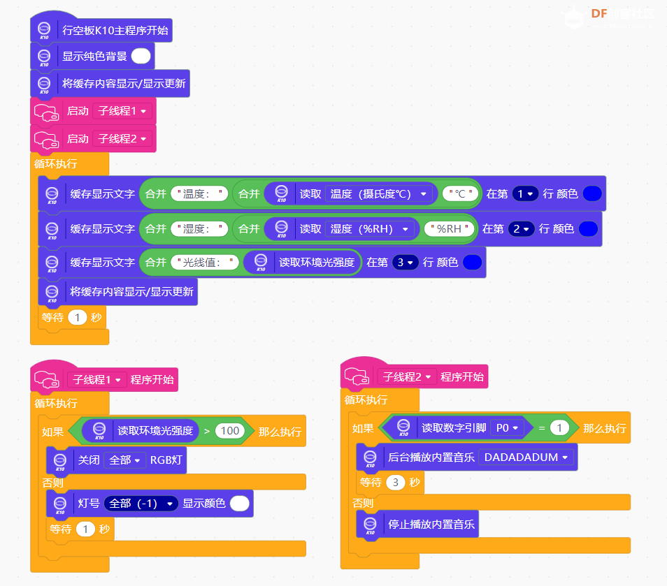 step3:运行调试 屏幕实时显示温度、湿度、光线值数据;按下P0的按钮可以播放音乐;遮住光线传感器可以点亮板载RGB灯。 二. 行空板M10行空板M10使用多线程参考此教程 [M10使用多线程案例] 三. 其它主控Arduino系列主控因为内存较小,所以不直接支持多线程。 可以采用系统运行时间实现类似功能,参考教程 [UNO采用系统运行时间实现多线程效果] 四. microbitmicrobit使用多线程案例参考此教程 [microbit多线程使用案例] |