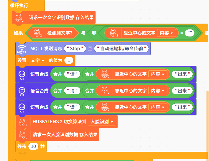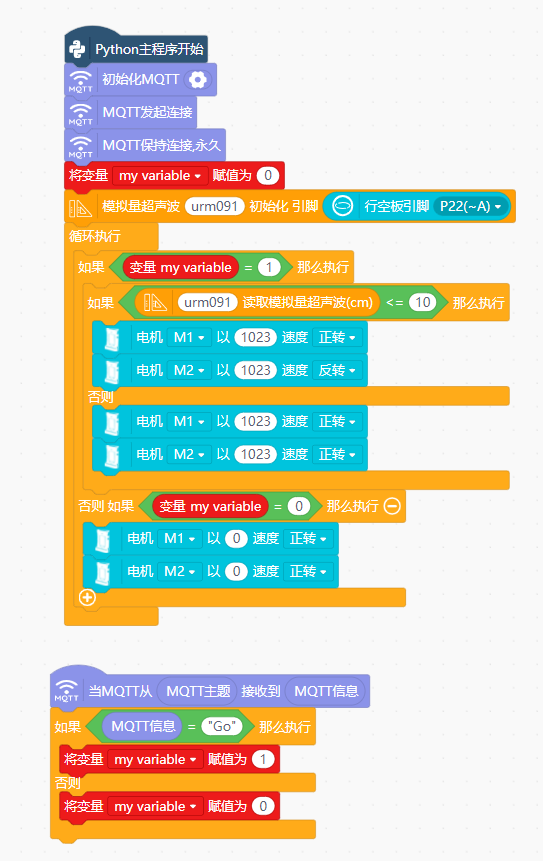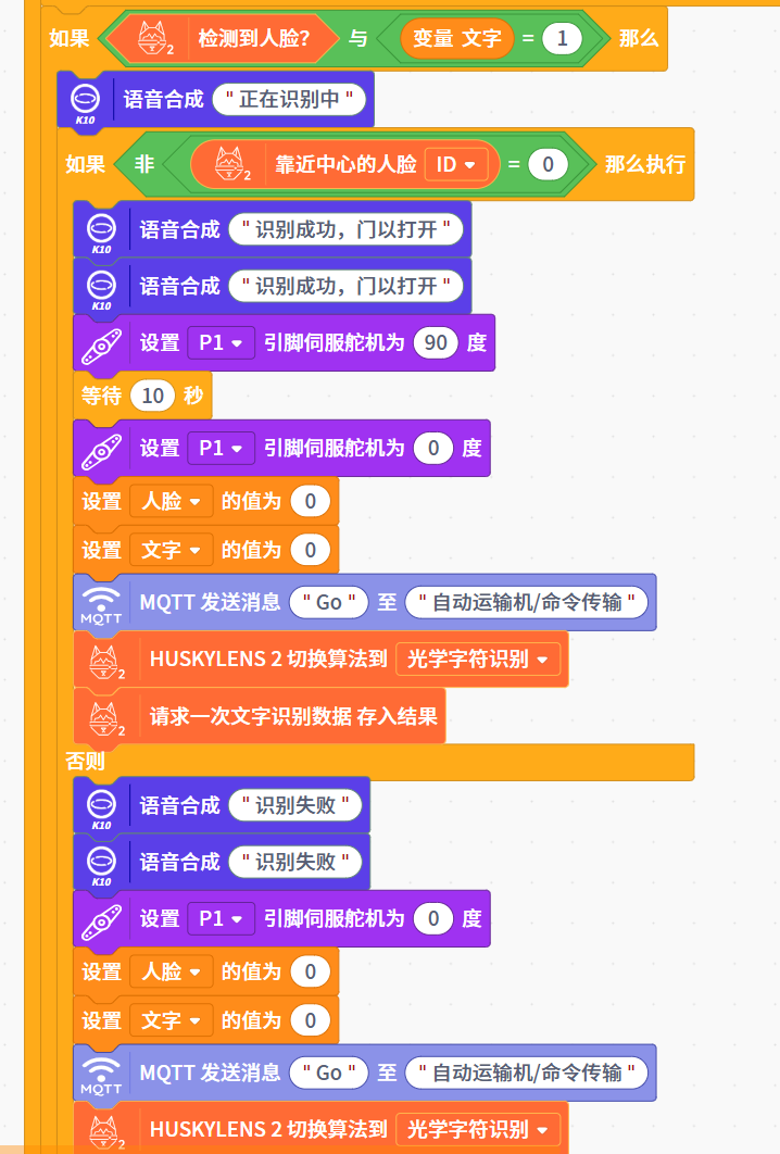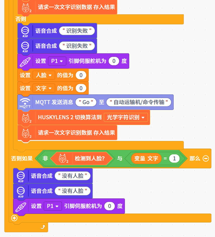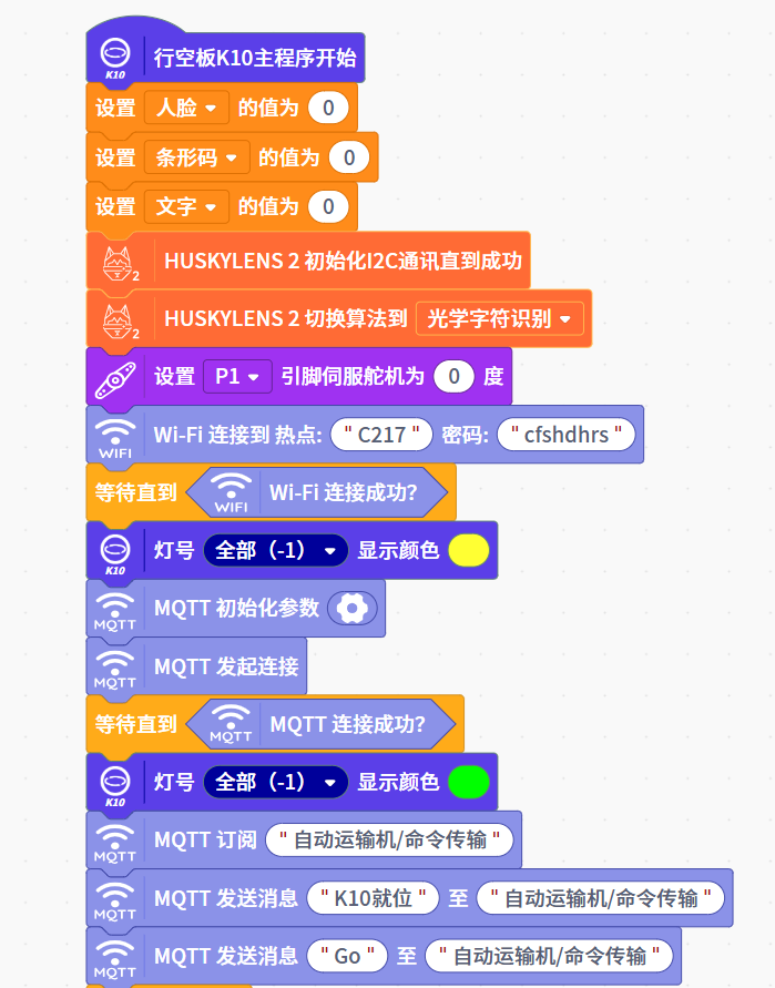 1.创作背景 在现代生活中,随着日益增长的物流需求,传统的人工配送模式存在人力成本高、效率低和错误率高等问题。为了解决这些问题,智能物流配送小车应运而生。 本项目以行空板M10+K10为主板,结合二哈识图 2。制作我们自己的智能物流配送小车。 2.项目材料 行空板M10 x1 行空板K10 x1 二哈识图 2 x1 行空板M10立式双路电机I/O驱动扩展板 x1 舵机 x1 轮子 x4 万向轮 x5 Mind+ 2.0 下载网址:Mind+官网 - 一站式满足程序设计、模型训练、界面设计。 3.硬件操作 3.1二哈识图 2 操作 首先,由于出厂语言默认为英文,我们可以使触屏的方式左右滑动,找到“System Settings”(系统设置)图标,将系统语言设置成自己想要的语言(支持英文,中文简体和中文繁体)。 ![]() ![]() ![]() 二哈识图2支持UART(串口)和I2C两种通信方式,本教程中使用I2C通信模式。 ![]() 找到“人脸识别”功能。![]() 出该人脸,并用白色圆点标记出眼睛、鼻子、嘴角的位置。如果画面中出现多个人脸,将会出现多个方框。 ![]() ![]() ![]() 3.2 行空板M10操作按照图中的样子安装TT电机 然后将超声波传感器插入22串口中 4.代码实现4.1行空板M10代码实现首先我们打开Mind+ 2.0,点击Python模式 点进去以后,点击拓展 搜索行空板M10和超声波![]() 加载完毕点击“返回”回到编程界面,在连接设备中点击“连接”。 连接成功以后,编写以下代码: 4.2行空板K10代码实现我们回到主页,点击上传模式 点进去以后,点击拓展 搜索行空板K10,舵机,MQTT,WI-FI和二哈识图2![]() 加载完毕点击“返回”回到编程界面,在连接设备中点击“连接”。 连接成功以后,编写以下代码:![]() ![]() ![]() 注:SIoT本地物联网平台下载安装教程 - IOT物联网 - Mind+首页外观参考: ![]() |