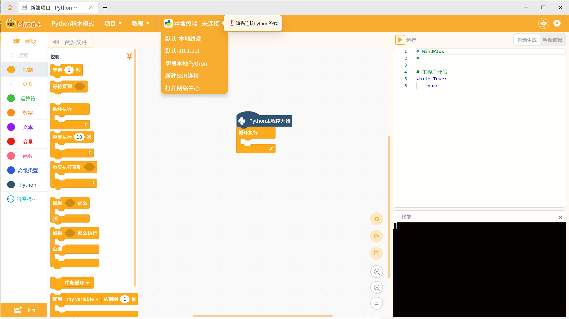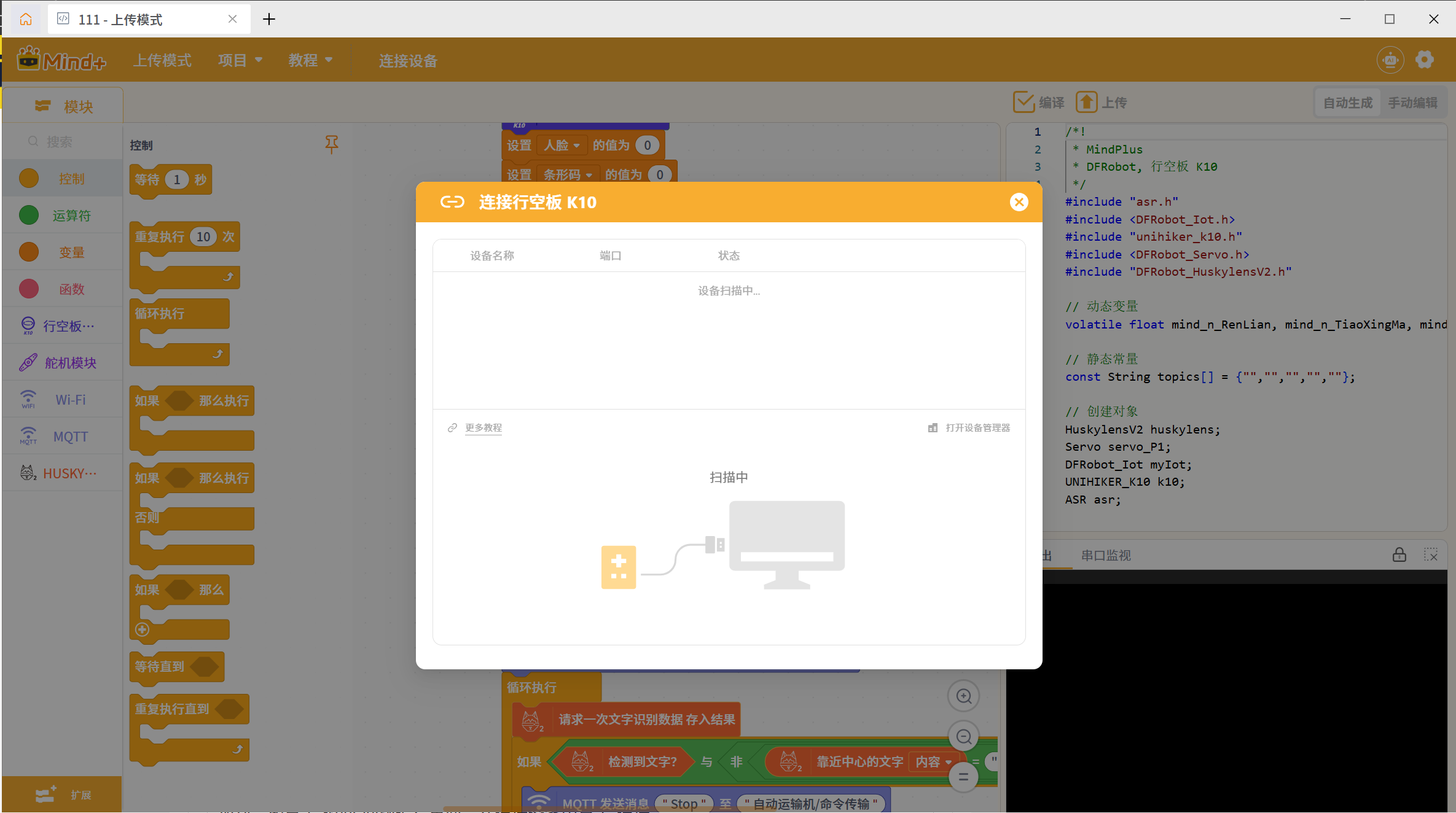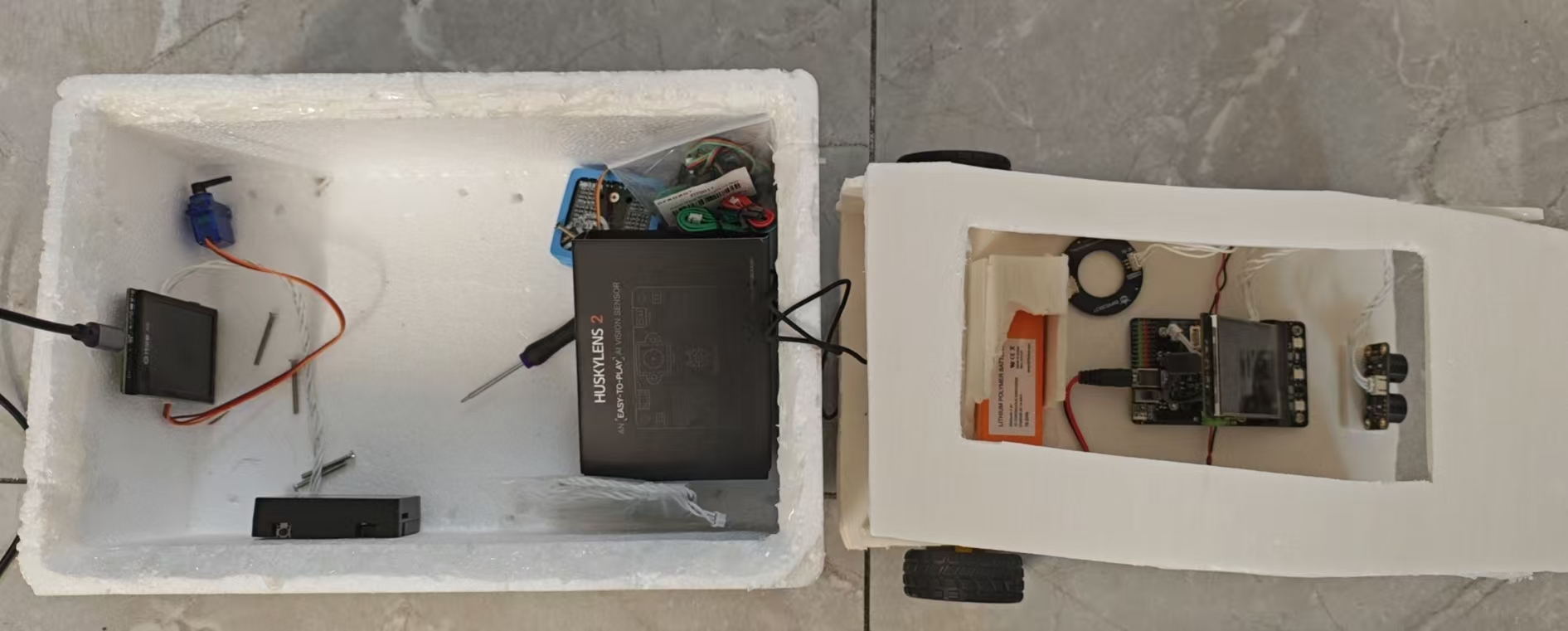 1.创作背景 在现代生活中,随着日益增长的物流需求,传统的人工配送模式存在人力成本高、效率低和错误率高等问题。为了解决这些问题,智能物流配送小车应运而生。 本项目以行空板M10+K10为主板,结合二哈识图 2。制作我们自己的智能物流配送小车。 2.项目材料 行空板M10 x1 行空板K10 x1 二哈识图 2 x1 行空板M10立式双路电机I/O驱动扩展板 x1 舵机 x1 轮子 x4 万向轮 x5 Mind+ 2.0 下载网址:Mind+官网 - 一站式满足程序设计、模型训练、界面设计。 3.硬件操作 3.1二哈识图 2 操作 首先,由于出厂语言默认为英文,我们可以使触屏的方式左右滑动,找到“System Settings”(系统设置)图标,将系统语言设置成自己想要的语言(支持英文,中文简体和中文繁体)。 ![]() ![]() ![]() 二哈识图2支持UART(串口)和I2C两种通信方式,本教程中使用I2C通信模式。 ![]() 找到“人脸识别”功能。![]() 出该人脸,并用白色圆点标记出眼睛、鼻子、嘴角的位置。如果画面中出现多个人脸,将会出现多个方框。 ![]() ![]() ![]() 3.2 行空板M10操作按照图中的样子安装TT电机 然后将超声波传感器插入22串口中 4.代码实现4.1行空板M10代码实现首先我们打开Mind+ 2.0,点击Python模式 点进去以后,点击拓展 搜索行空板M10和超声波![]() 加载完毕点击“返回”回到编程界面,在连接设备中点击“连接”。 连接成功以后,编写以下代码: 4.2行空板K10代码实现我们回到主页,点击上传模式 点进去以后,点击拓展 搜索行空板K10,舵机,MQTT,WI-FI和二哈识图2![]() 加载完毕点击“返回”回到编程界面,在连接设备中点击“连接”。 连接成功以后,编写以下代码:![]() ![]() ![]() 注:SIoT本地物联网平台下载安装教程 - IOT物联网 - Mind+首页外观参考: ![]() |