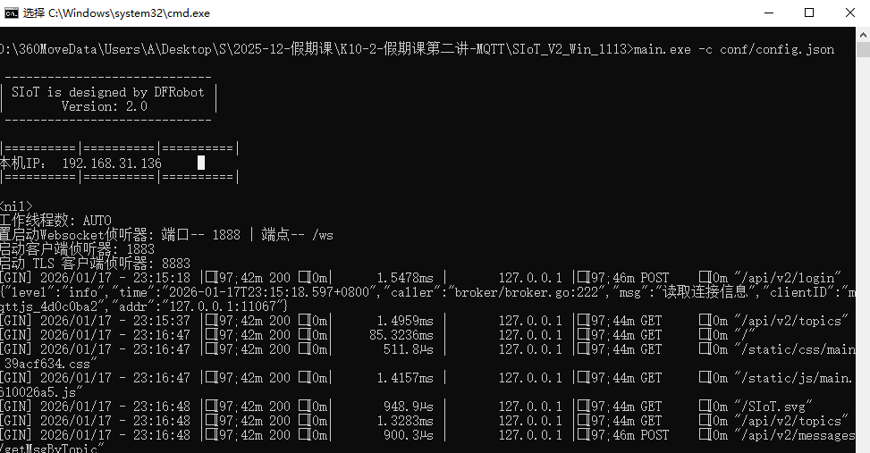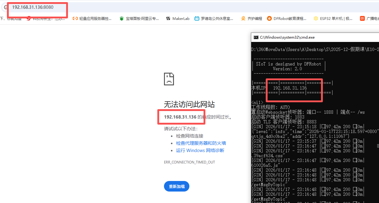 我完全按照教程来操作 ![]() 这里我的mqtt这样设置的 ![]() 然后我正常启动start SIoT.bat ![]() 接下来我启动mind+中的可视化面板 ![]() 当前是可以成功的,然后我通过浏览器访问http://127.0.0.1:8080/ 也是没有问题的 ![]() 但关键在于 我无法通过ip地址访问?http://192.168.31.136:8080 ![]() 所以我的行空板K10 仅仅显示正常wifi连接后 后面的mqtt一直处于无法连接状态 所以下面的文字一直都不显示 ![]() 请问各位老师和技术大佬 z这是什么情况 |