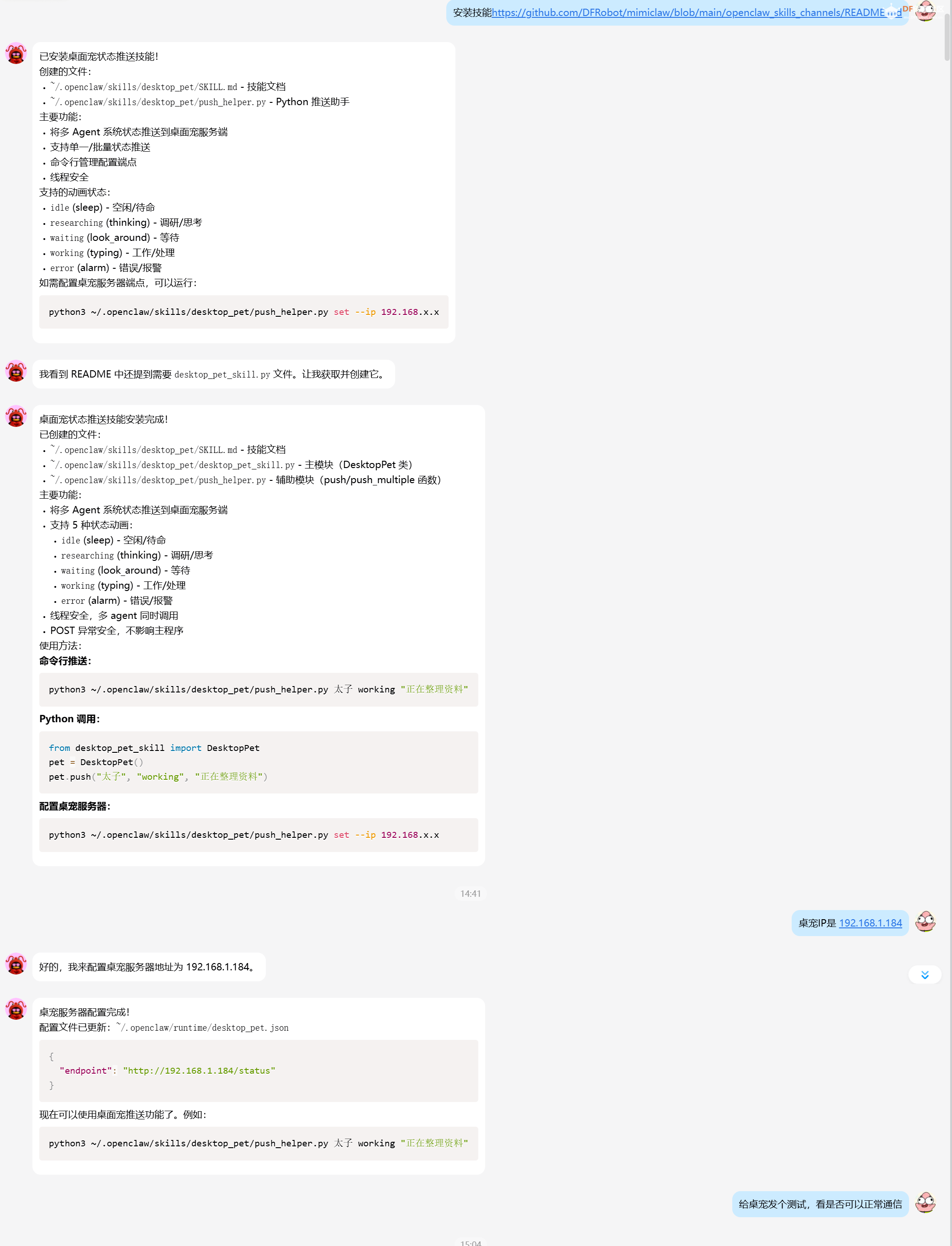 执行完成之后,会看到mimiclaw文件夹 2. 拷贝资源到SD卡 进入mimiclaw文件夹,把sdcard文件内的所有文件,全部拷贝在SD卡上,确认打开SD卡,就能看见config,img,memory,skills这四个文件夹 3. 编译运行MimiClaw 把安装好的ESP-IDF打开,进入mimiclaw的文件下,使用如下指令进行编译和下载 一般第一条指令只用执行一次,执行完全部三条命令之后,就可以看见程序下载进入我们的行空板k10啦,这能检测当前是否有错误 4. 配置文件 当我们检查完,流程跑通之后,我们可以在配置文件配置自己的WIFI,使用的模型,和相应的密钥,并且配置我们创建的飞书机器人的ID和密钥 配置文件在 main/mimi_config.h,下面是我们下载时的mimi_config.h文件需要修改的部分 模型支持两种,一个是openai,一个是anthropic,根据自己的需求需要更新下面的字段,我使用的是MiniMax,这样配置 除此之外,可能不同模型对于Token的限制不一样,这个也需要进行更改 5. 智能体助手注册/浏览器注册 飞书: 参考下面的链接进行注册,创建一个属于自己的飞书机器人并进行发布 [飞书机器人配置] 注意:飞书注册好之后,可以自己创建一个只有自己的群聊,然后点击右上角添加机器人进来,此后可以通过@机器人 来进行对话,如果想要在多人群聊中进行使用,需要注意是外部群聊还是内部群聊,需要进行设置,可以参考这个: [把飞书机器人添加到群聊] Tavily: 这个是比较好注册的,推荐使用谷歌或者是Github等第三方账号直接进行登录 [tavily注册] 部署在PC端我们需要在我们的openclaw上接入我们的QQ bot 1. 注册QQ机器人 [QQ机器人注册链接]前往此链接,根据指示创建,保存得到的AppID和AppSecret 2.把QQ机器人绑定openclaw 打开openclaw,使用下面的命令,在channel界面对QQ进行注册(新版本有的功能) openclaw config 或者使用下面的方式,使用QQ Bot插件的原生注册方式,参考下面的链接 [QQBot注册] 此时我们就能够通过手机的QQ机器人来和openclaw进行沟通了 3. 部署桌宠客户端 既然我们已经拥有了QQ机器人,那么我们就可以让他直接帮我们下载桌宠的源码,这样我们就不需要自己动手啦,毕竟使用桌宠还是为了解放双手嘛~ 让他直接按照我们源码仓库的openclaw_skills_channels下的readme.md文件进行安装,URL在下面 https://github.com/DFRobot/mimiclaw/blob/main/openclaw_skills_channels/README.md 之后我们需要设置连接的IP,此IP就是我们K10的IP哦(会显示在屏幕上),也可以通过串口日志进行查看 ![]() 我们可以说:桌宠IP是xxxxx,来进行设置 下面我提供了一份操作的流程图,供参考: ![]() 到此,我们的PC端全部配置完成,可以把MimiClaw使用起来了 感谢 本项目 DFRobot/mimiclaw 基于memovai/mimiclaw 进行移植与二次开发,首先向原仓库的作者与贡献者致以最诚挚的感谢! 感谢 memovai/mimiclaw 开创性地将 OpenClaw 带到 ESP32-S3 这样小巧、低成本的硬件上,让“口袋里的 AI 助手”成为可能。没有你们的前瞻性设计与扎实的基础工作,就不会有本项目在 行空板K10 上的落地。 我们在原项目的基础上,针对 行空板 K10 的硬件特性进行了适配与优化,希望能让更多创客、开发者、教育者和爱好者,以更低门槛体验硬件 AI 智能体的魅力。 邀请你参与 K10 版本的使用与共建 如果你正在使用或计划使用 行空板 K10 运行MimiClaw,我们非常欢迎你: