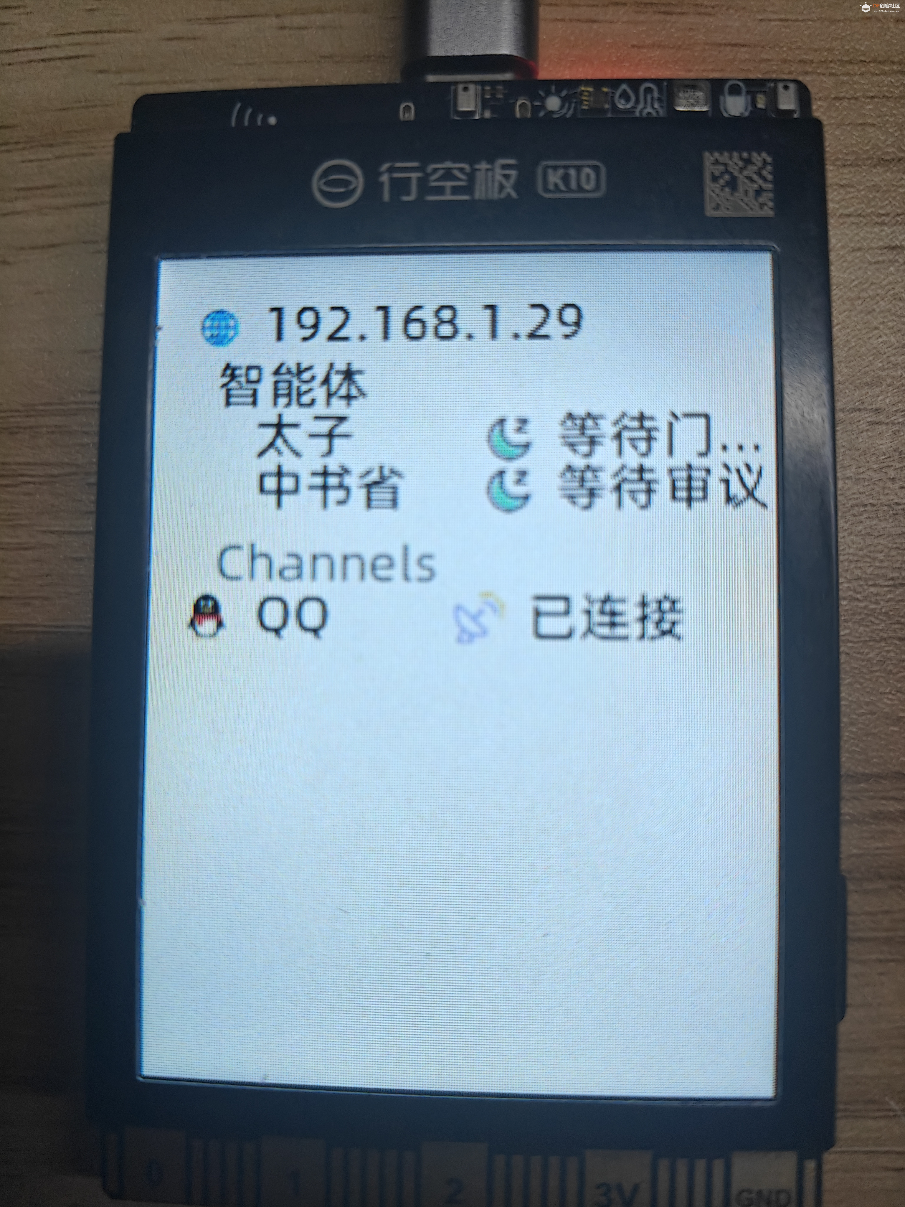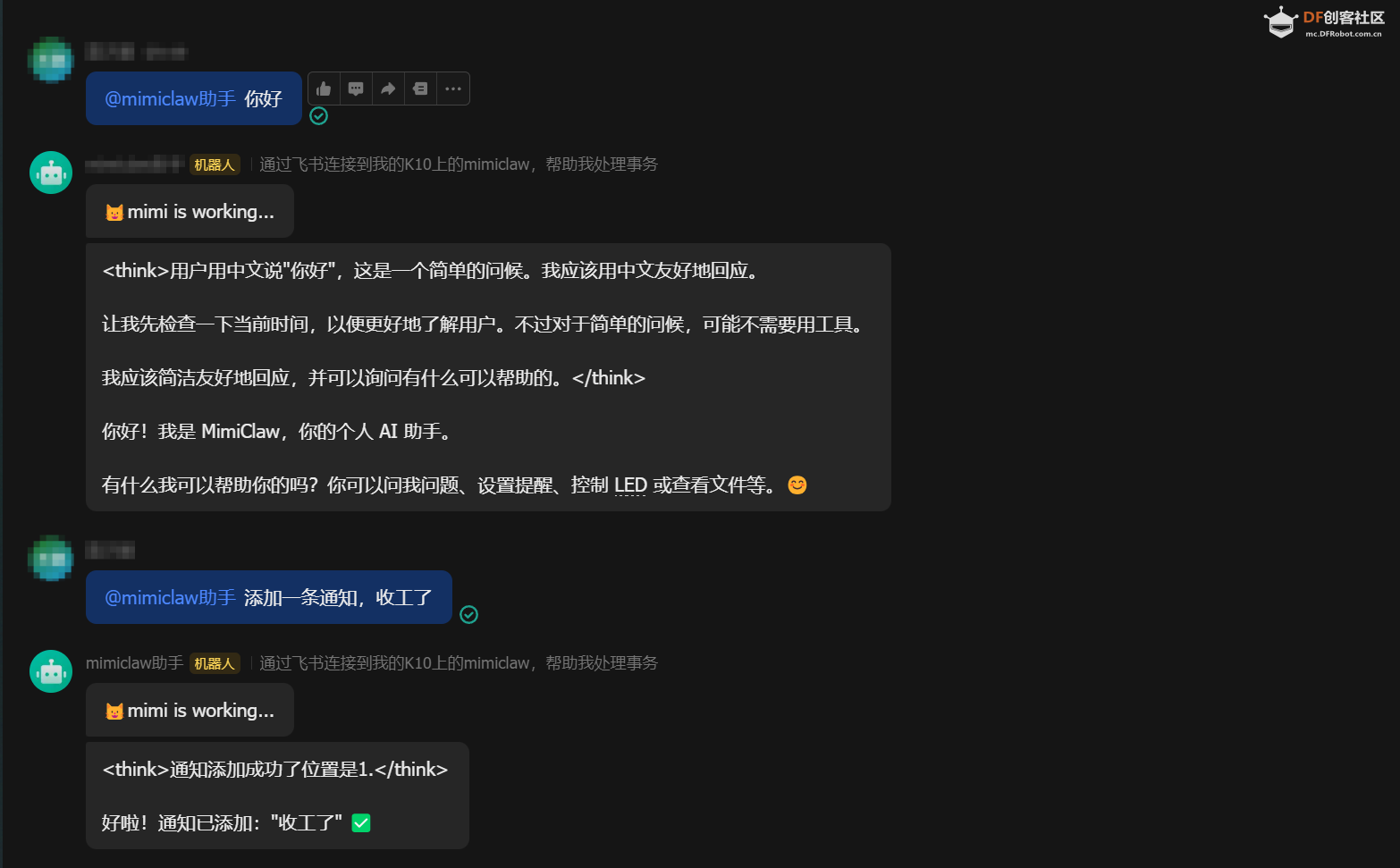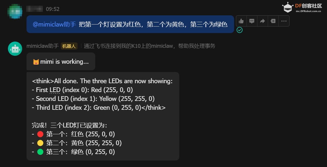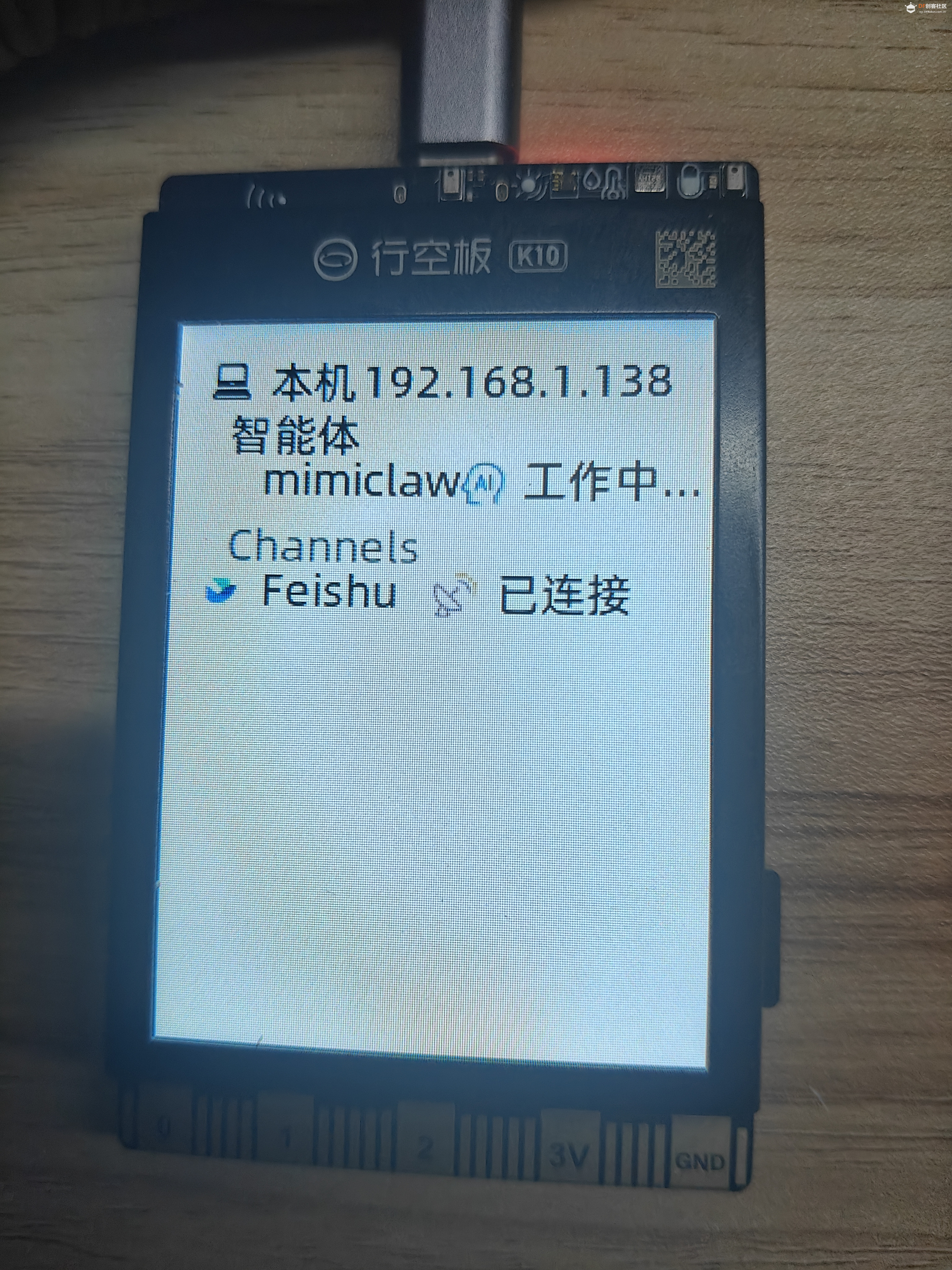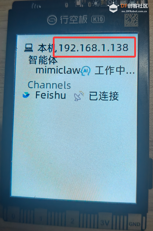 本帖最后由 栗悟饭与龟波功 于 2026-4-7 12:20 编辑 MimiClaw是什么? Mimiclaw是芯片上的 AI 助理,没有 Linux,没有 Node.js,纯 C,可以把一块小小的 ESP32 开发板变成你的私人 AI 助理。插上 USB 供电,连上 WiFi,通过 Channel(比如飞书) 跟它对话 ,它能处理你丢给它的任何任务,还会随时间积累本地记忆不断进化 ,而这些全部跑在一颗拇指大小的芯片上 MimiClaw的源码,地址在:https://github.com/memovai/mimiclaw 我们结合K10的硬件分布对其进行了移植,把其成功部署在K10行空板上 话不多说,我们先来看看效果,然后带着大家手把手的把Mimiclaw Mimiclaw K10行空板仓库开源地址:https://github.com/DFRobot/mimiclaw 效果展示Mimiclaw可以干什么?