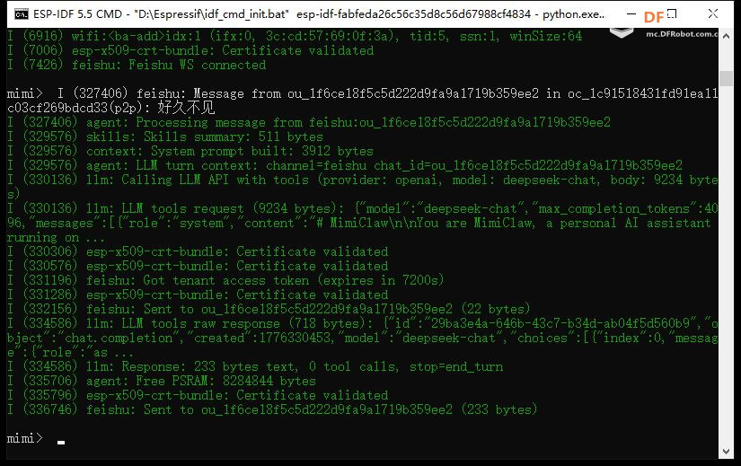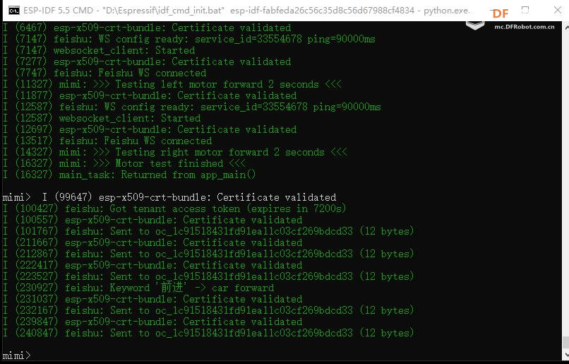 ## 四、启动验证(快速判断部署是否成功) 烧录完成后,开发板自动重启,打开串口监视器(波特率 115200),若出现以下日志,即说明基础部署成功: 测试验证:在飞书中给机器人发送“你好”,若 LLM 网络正常,机器人会回复消息;若出现 LLM 调用失败(如 TLS 证书错误),可直接跳过,进入二次开发的关键词控制环节,不影响小车核心控制功能。 |
