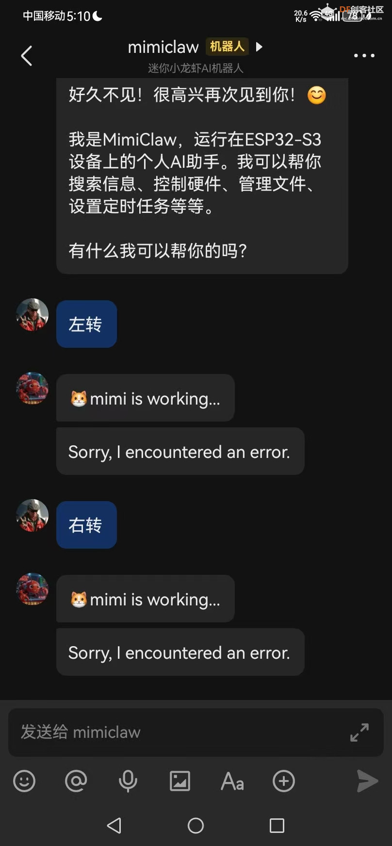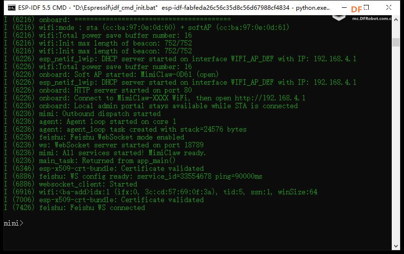 本帖最后由 驴友花雕 于 2026-4-17 06:34 编辑 2. 克隆 MimiClaw 源码(优先选用稳定仓库) 官方开源 https://github.com/memovai/mimiclaw,核心目录包含 main、docs、scripts 等,支持 ESP32-S3 专属配置,可直接用于部署。也可使用镜像仓库 https://gitcode.com/RealGao/mimiclaw 。 3. 配置 mimi_secrets.h(必填项,否则编译/运行失败) 该文件是 MimiClaw 核心配置文件,包含 WiFi、飞书、大模型 API 等关键信息,必须从模板复制生成,不可手动新建(手动新建会导致格式错误)。参考相关仓库配置规范,该文件支持 Tavily 搜索、代理等功能的灵活配置。 关键提示: (1)飞书机器人需在飞书开放平台开启「im.message.receive_v1」事件订阅,否则无法接收用户消息,导致 LLM 对话、博查搜索及小车控制功能全部失效; (2)LLM、DeepSeek、博查三者需同时配置正确,才能实现“飞书发消息→LLM解析→博查搜索(如需)→响应反馈”的完整流程; (3)若仅需小车关键词控制,可跳过 LLM 和博查配置,不影响核心控制功能(后续再补上)。 |