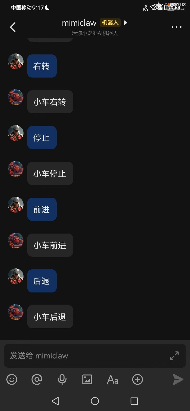本帖最后由 驴友花雕 于 2026-4-17 06:47 编辑 2. 修改 feishu_bot.c,实现关键词控制 找到 main/channels/feishu/feishu_bot.c 文件,在 handle_message_event 函数中,解析出用户消息(cleaned 变量)后,添加以下关键词匹配逻辑,实现小车前进、后退、左转、右转、停止的精准控制: 3. 重新编译烧录 # 重新编译并烧录,应用修改 4. 测试验证 在飞书中给机器人发送关键词:“前进”“后退”“左转”“右转”“停止”,小车会立即执行对应动作,同时飞书会收到“小车XX”的反馈消息,全程无需依赖 LLM 网络调用,响应迅速、稳定可靠。 |